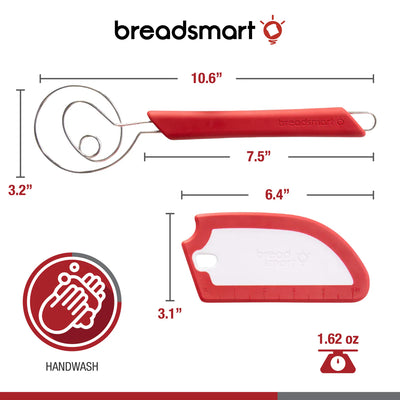 The Breadsmart bread making Whisk and Bench Scraper Duo is the perfect set for prepping dough. The whisk has a unique triple-looped design, perfect for mixing thick dough. The SmartScraper serves 5 unqiue purposes: folding dough, moving dough, dividing dough, cleaning counters and measure proofing rises with the embossed ruler.
